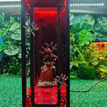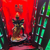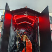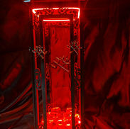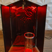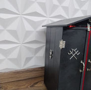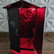 Em MDF, forrada internamente com cetim vermelho. Seu piso foi feito em pedrarias pretas e vermelhas.Com porta de abre-fecha e toda simbologia de Exu.