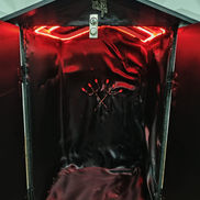 Em MDF, com forracao ao fundo e piso de cetim preto. Iluminacao led vermelha no teto.